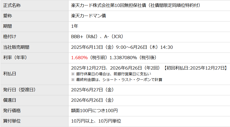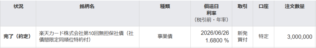本日(6月13日)から「楽天カード株式会社第10回無担保社債」の販売が各証券会社で開始されます。楽天証券では午前9時から販売開始されましたので、私も購入しました。