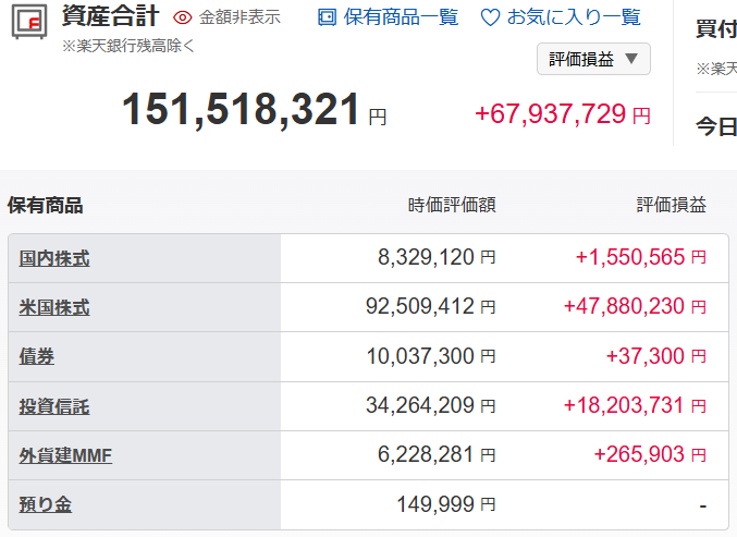 上記資産総額のうち、楽天証券口座の評価額(11月29日現在)は1億5,151万円です。