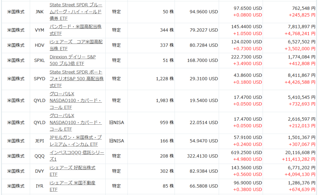 楽天証券で保有している銘柄の内訳と、各銘柄の損益状況は以下の通りです。