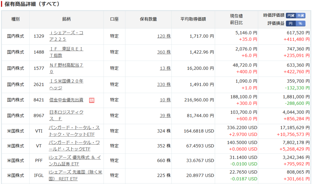 楽天証券で保有している銘柄の内訳と、各銘柄の損益状況は以下の通りです。