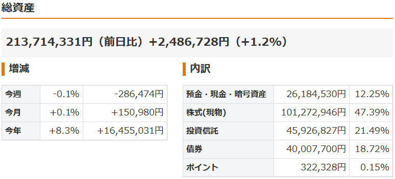 マネーフォワードで管理できない金額が約1,400万円(60歳以降に年金として受け取る退職金900万円、保険解約返戻金500万円)ありますので、資産総額としては約2億2千771万円となります。