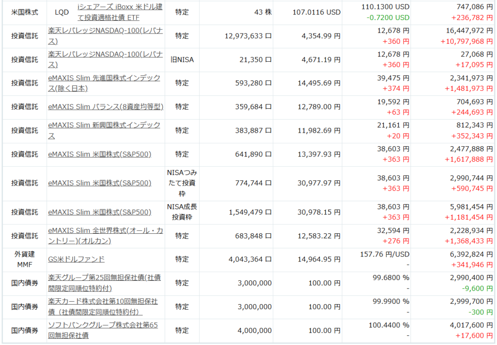 「投資信託」につきましては、NASDAQ100が下落し、特定口座で保有している「楽天レバナス」の含み益が「+1,174万円」から「+1,079万円」に減少(▲95万円)しました。