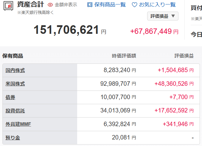 上記資産総額のうち、楽天証券口座の評価額(12月20日現在)は1億5,170万円です。