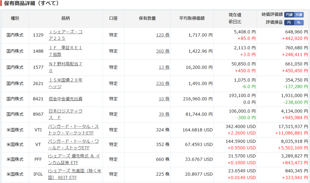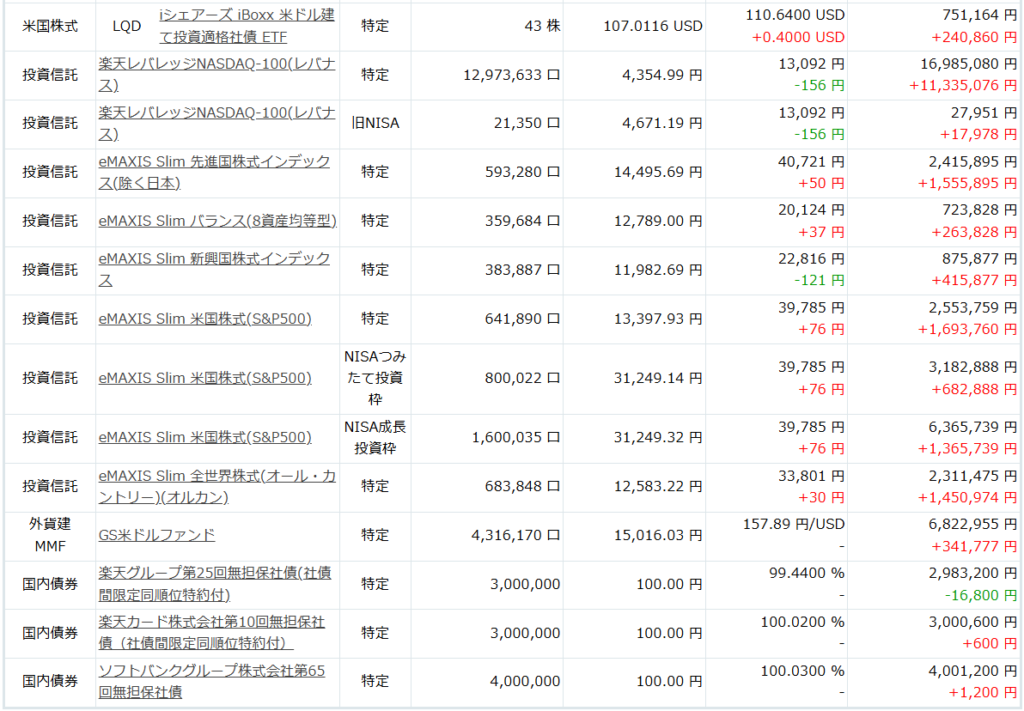 楽天証券で保有している銘柄の内訳と、各銘柄の損益状況は以下の通りです。