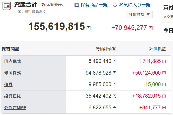 上記資産総額のうち、楽天証券口座の評価額(1月10日現在)は1億5,561万円です。