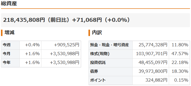 マネーフォワードで管理している資産総額(1月17日現在)以下の通りです。