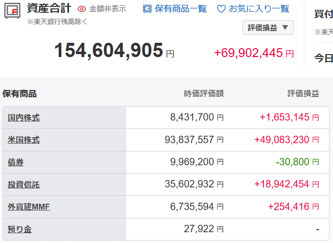 上記資産総額のうち、楽天証券口座の評価額(1月24日現在)は1億5,460万円です。