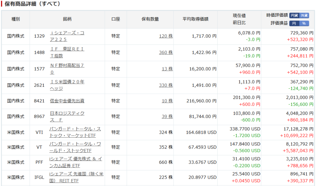 楽天証券で保有している銘柄の内訳と、各銘柄の損益状況は以下の通りです。