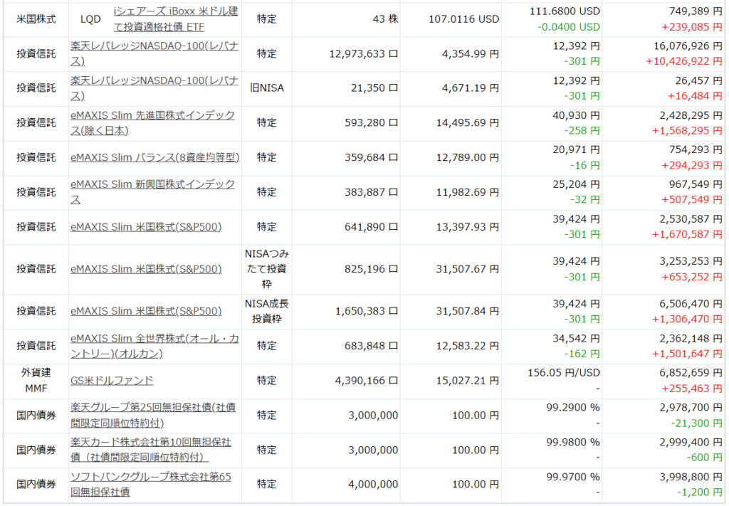 「投資信託」につきましては、NASDAQ100が上昇し、特定口座で保有している「楽天レバナス」の含み益が「+1,014万円」から「+1,042万円」に増加(+28万円)しました。